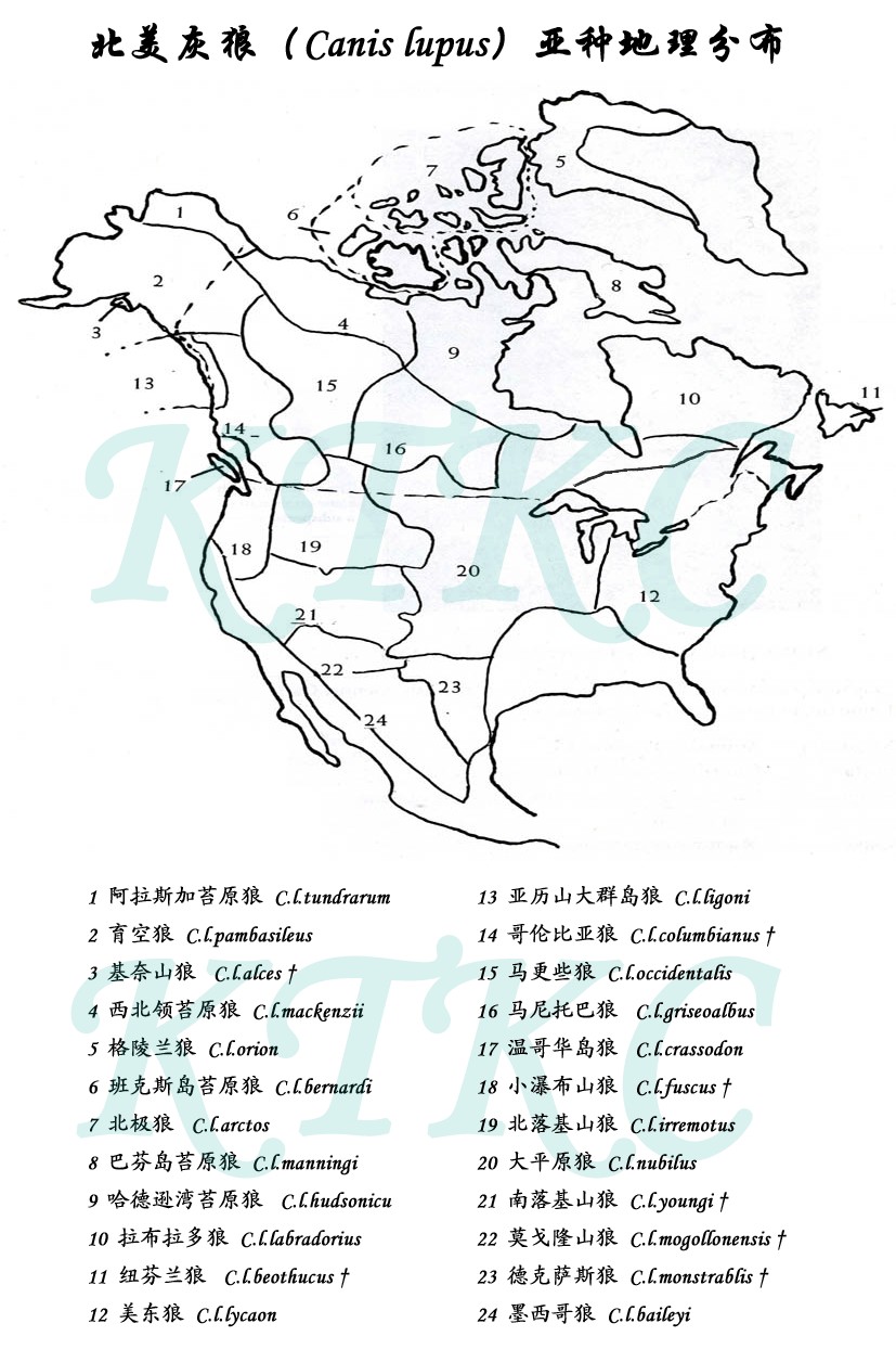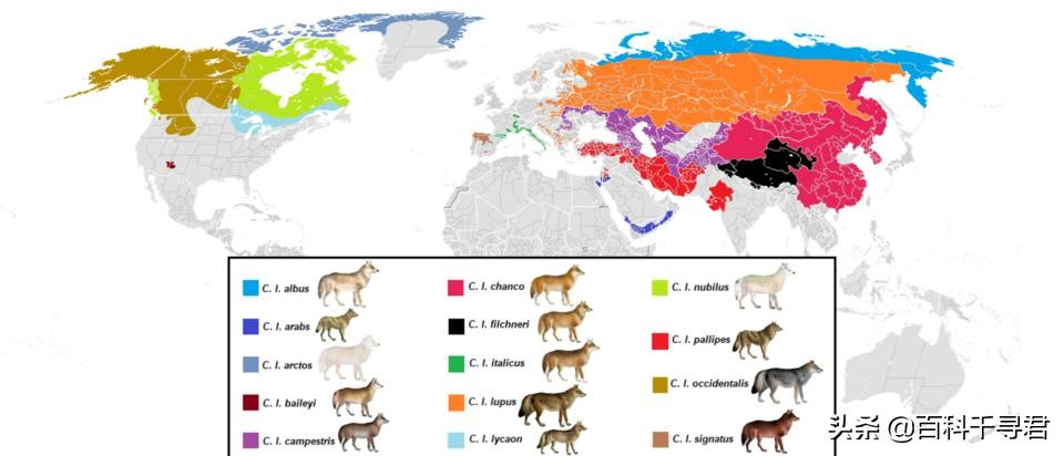 灰狼14个现存野生亚种分布图