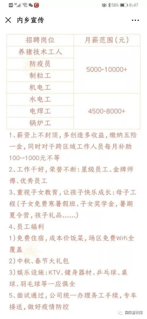 据悉,2020年春节期间,牧原集团已运用科技手段迅速转变招聘模式,通过线上宣讲、视频面试,让应聘者用一部手机找到心仪工作。此番公司将继续面向内乡县再提供2万个就业岗位,包括养猪技术工人、防疫员等,月薪5000元至10000+不等,并表示薪资上不封顶,对于跨区域工作人员每月补助100至1000元不等,此外还有免费住宿、KTV娱乐提供。面试通过,公司将统一办理务工手续,专车接送,做好疫情防控。
