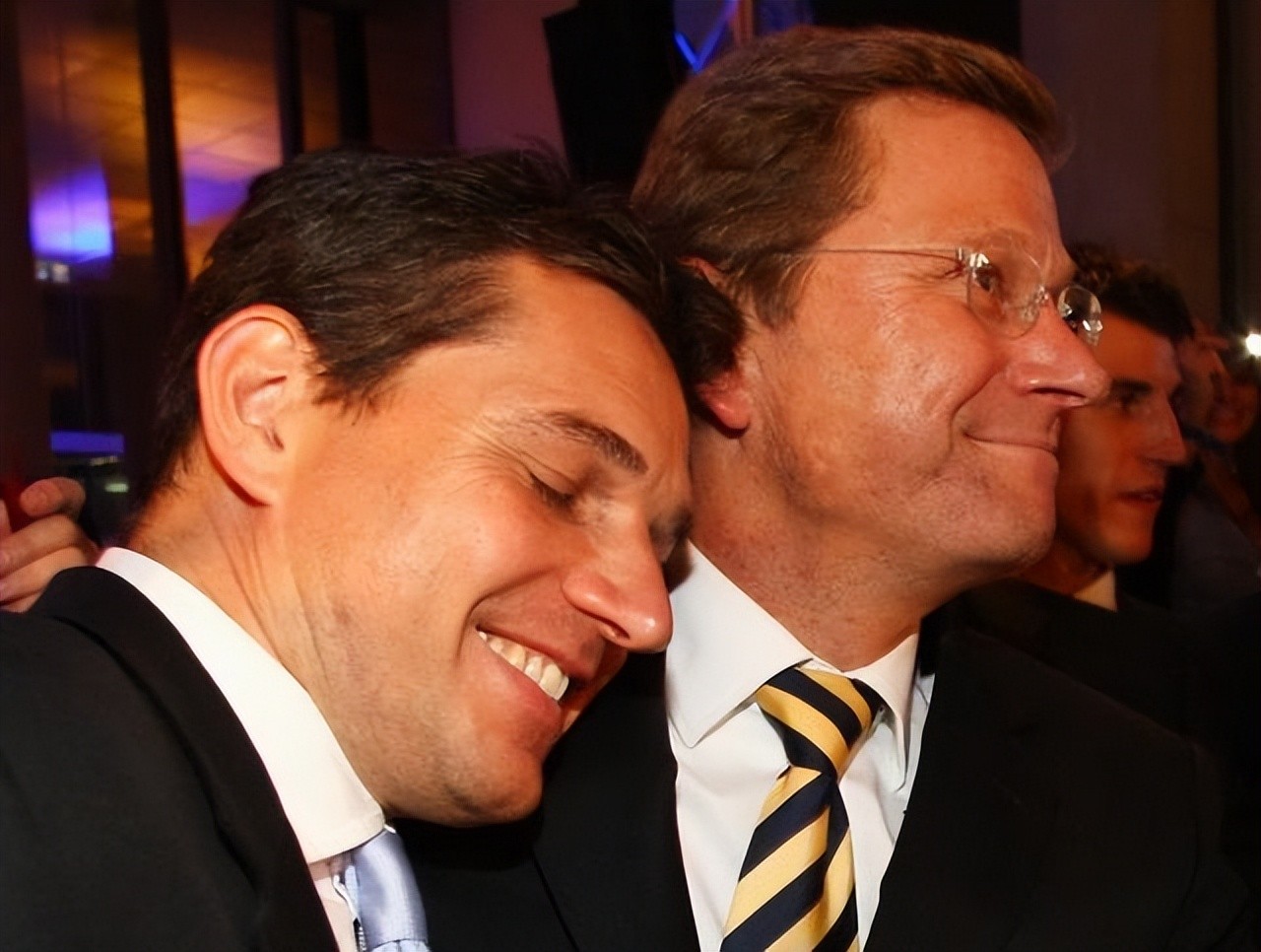 3、国自由民主党主席基多·威斯特威勒。2009年9月27日,德国第17届联邦议院选举初步结果27日晚揭晓,自民党获得大约14.7%的选票,有望与联盟党组成执政联盟。德国柏林,德国自由民主党主席基多·威斯特威勒(右)与“男友”迈克尔·穆隆兹一起庆祝。