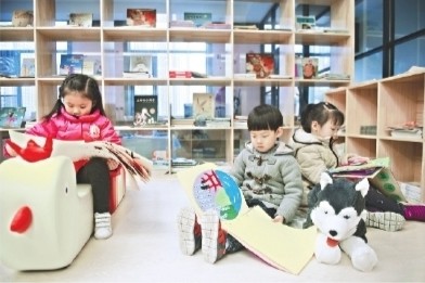 稚美幼儿园传奇分园图书屋里,几个小朋友正在阅读幼儿园自制绘本