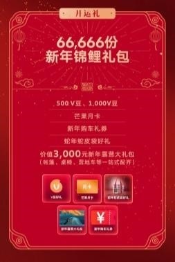 开运礼:为迎接农历蛇年,上汽大众还准备了66,666份新年锦鲤礼包,其中包括价值3,000元的新年露营大礼包、500/1,000 V豆、芒果月卡、新年购车礼券、蛇年蛇皮袋好礼等。这份“开运礼”给消费者带来了实实在在的优惠,在新年的喜庆氛围中更蕴含了好运一整年的美好祝愿。