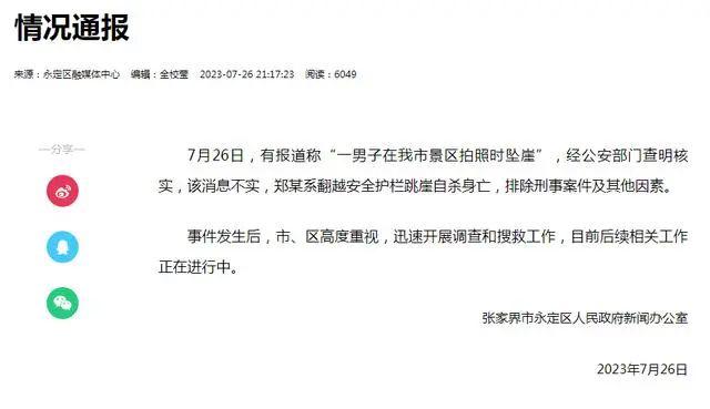 7 月 26 日,有报道称 " 一男子在我市景区拍照时坠崖 ",经公安部门查明核实,该消息不实,郑某系翻越安全护栏跳崖自杀身亡,排除刑事案件及其他因素。