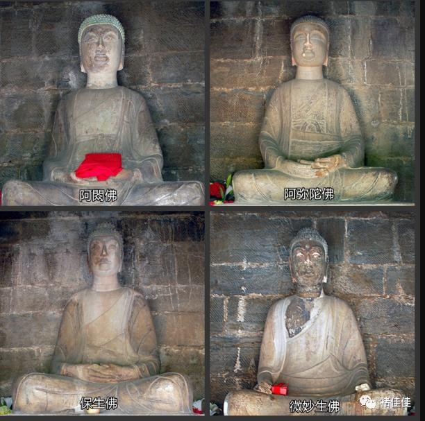 四门塔塔心柱四面台上有后人移置的四尊佛像。四个佛像各有自己的名号:西边叫阿弥陀佛;南边叫保生佛,东边叫阿閦佛,北边叫微妙声佛。塔檐部挑出叠涩五层,塔顶为23层石板叠筑而成的四角攒尖正方锥形顶,上置方形须弥座,四角置山华蕉叶饰,中央安置一座雕刻精巧的石相轮。
