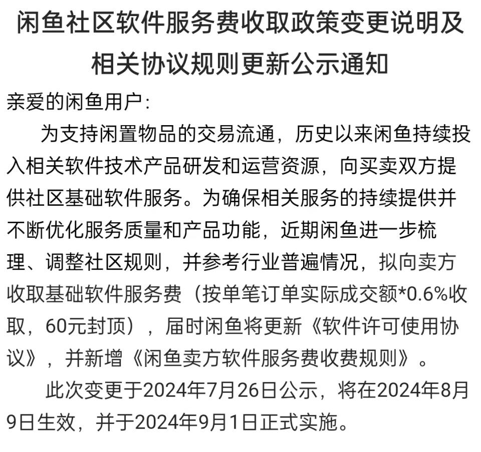 三言科技 7 月 26 日消息,今日,闲鱼发布公示,宣布将面向全体卖家收取 0.6% 的基础软件服务费(单笔最高收取 60 元)。同时仅针对同一自然月内,产生的成交订单数量大于 10 件且累计成交金额大于 10000 元的卖家,超出后的每一笔订单实际成交额的 1% 收取软件服务费。