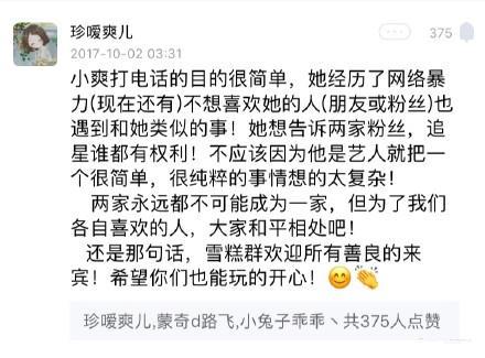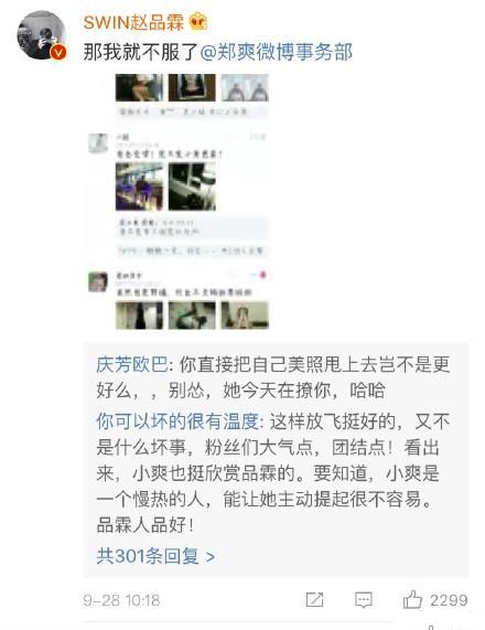 郑爽电话联线SWIN成员赵品霖,两个人聊了11分钟。赵品霖之前就在微博表达过对郑爽的喜爱,后来也去了雪糕群,郑爽为了不让别人说赵品霖是为了蹭热度,才连线他澄清一些事。