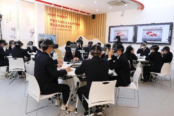 学院思政公开课现场,学生用VR设备进行红色文化学习。