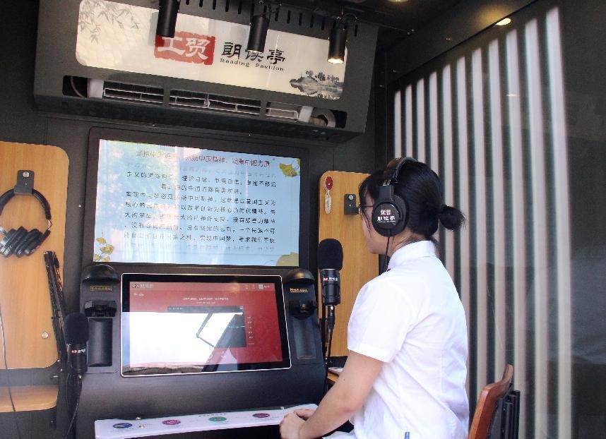 学生在红色朗读亭朗读红色经典。