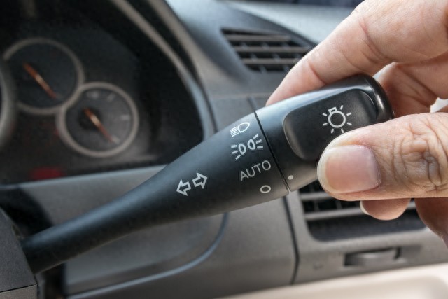 在灯光模拟考试开始时,语音提示“请开启前照灯”,此时考生应将灯光开关拧至近光灯位置。当听到“夜间在有路灯,照明良好的道路上行驶”的指令,也要使用近光灯。因为在照明良好的环境下,近光灯既能满足驾驶员看清前方路况的需求,又不会对其他道路使用者造成眩光干扰。例如城市的主干道,路灯排列整齐,光线充足,使用近光灯就足以保障行车安全。