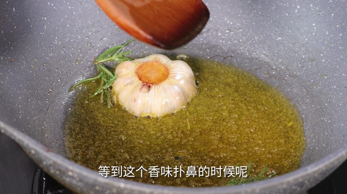 2.黄油融化后加入小株迷迭香,半颗正切的大蒜煎香。