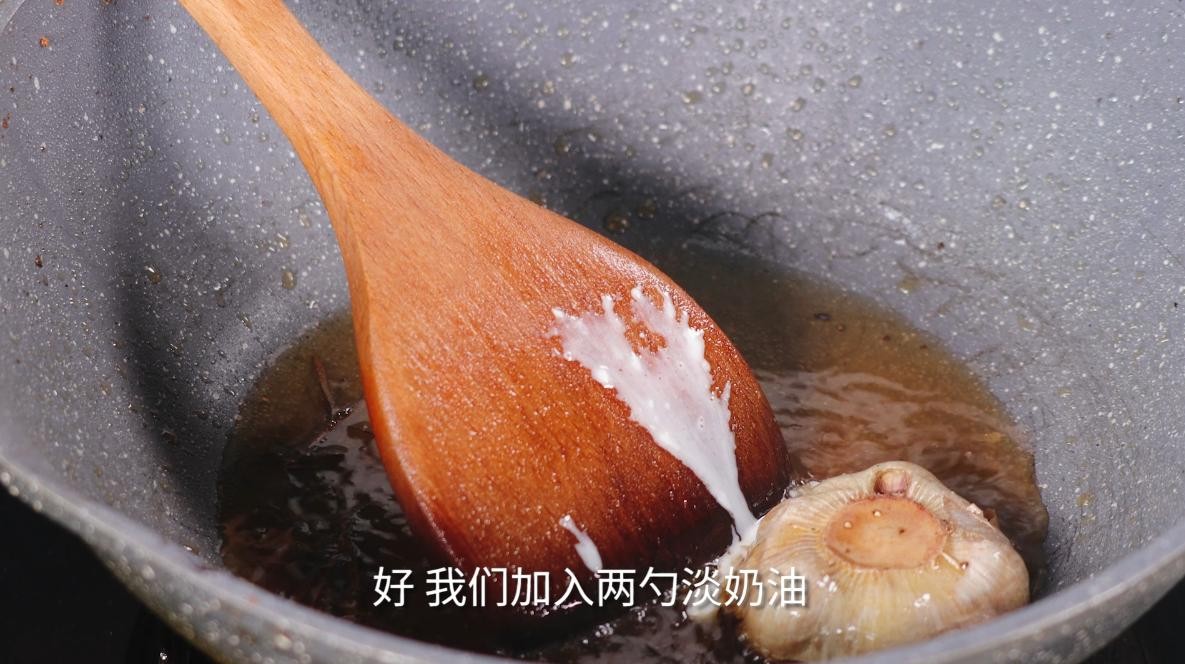 4.烧开后加入2勺淡奶油,搅拌均匀。