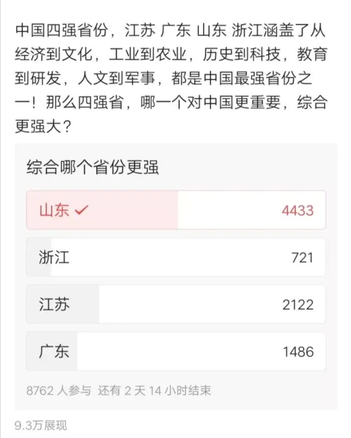 通过投票,看得出山东在人们心中综合实力确实挺强。唯一不足就是网络,互联网时代山东远远落后于南方各省。