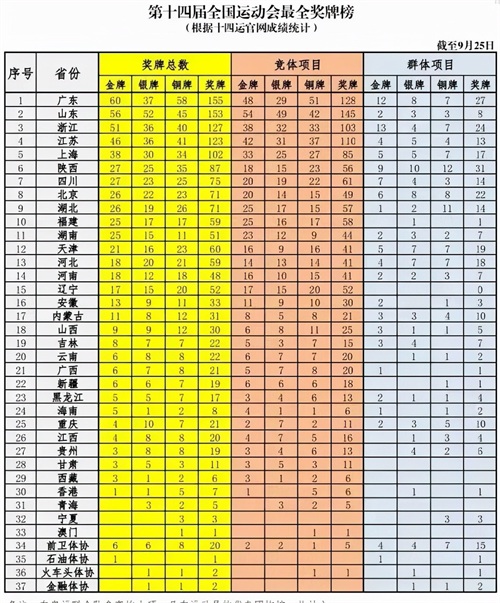 以下是截止25日的竞体加群体比赛项目金牌榜排名,(ps:群众项目是娱乐,重在参与,不参与竞技排名)