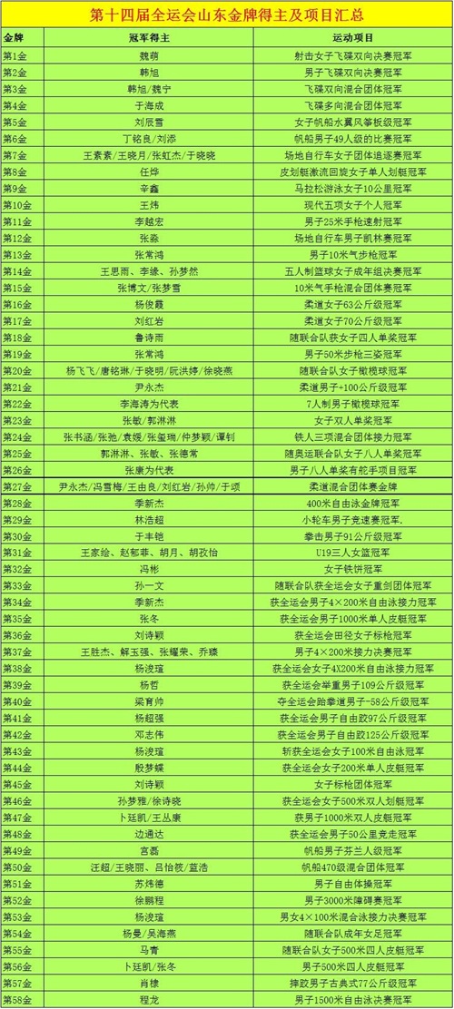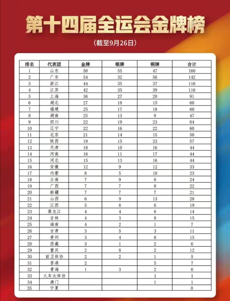 随着第十四届全运会比赛的落幕,上万名运动员群雄角逐,凭实力夺冠。在31个大项、358个小项的竞技项目中,山东代表队再度加冕,以58枚金牌第一,55枚银牌第一,47铜牌屈居第二,总奖牌160枚,荣获全国首位。