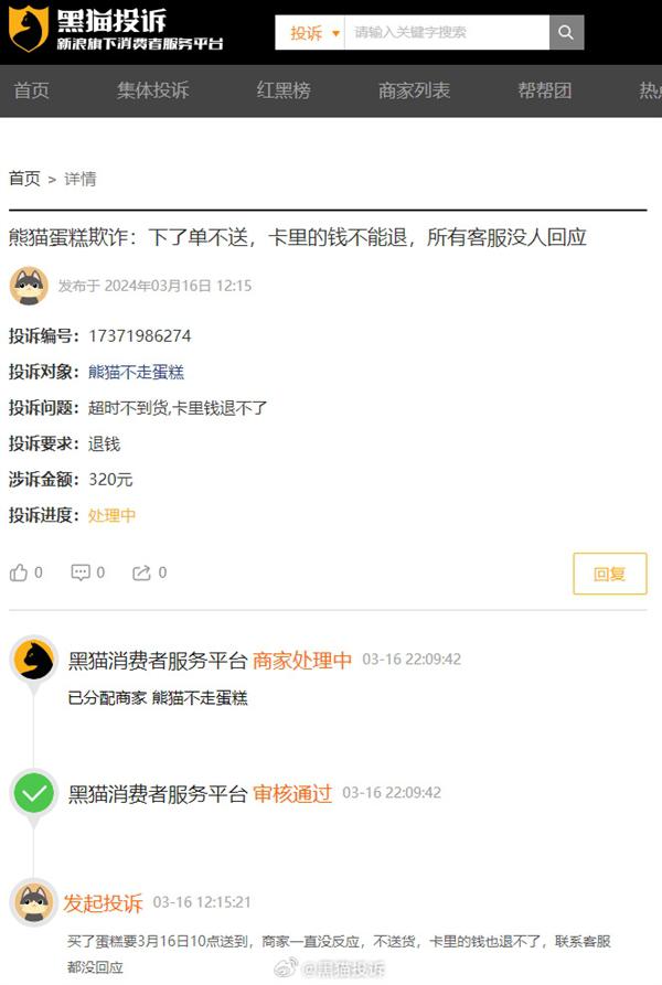此外,黑猫投诉上也有不少消费者投诉从熊猫不走购买的蛋糕无法配送,充值金额无法退还,客服联系不上等情况。