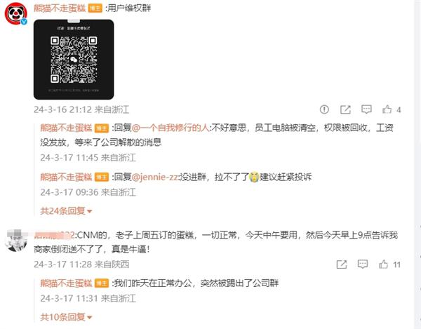 “熊猫不走蛋糕”员工官微讨薪:三四个月工资未发 老板失联钉钉解散