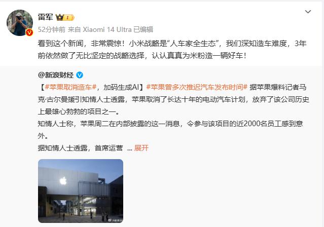 对于苹果放弃造车的消息,雷军 2 月 28 日在微博发文称:" 看到这个新闻,非常震惊!我们深知造车难度,3 年前依然做了无比坚定的战略选择,认认真真为米粉造一辆好车!"