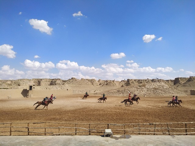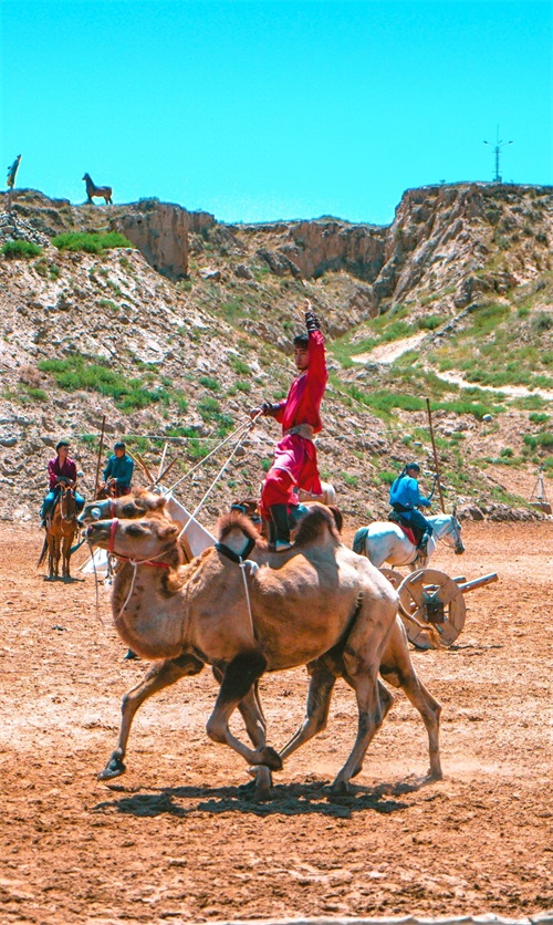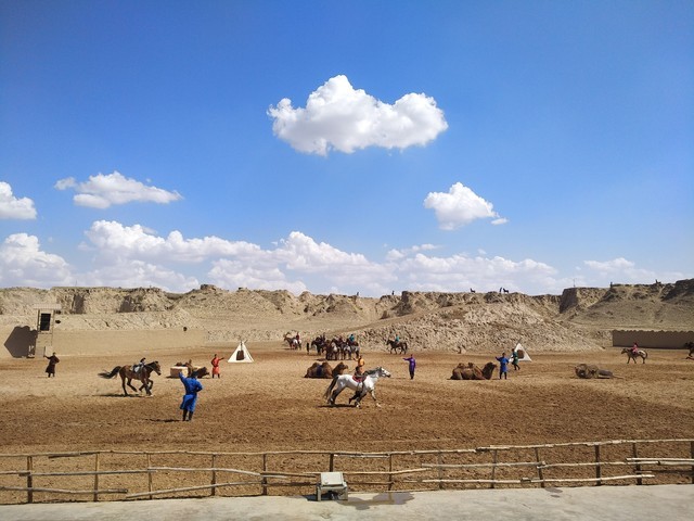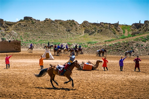 技艺精湛的马战演员,在风驰电掣中翻转腾挪、时而上下骑乘良驹翻飞、时而马背驱驰绝尘而去,呈现和电影一样的实景马战表演。马上有人,胯下有马,人马合一、天人合一的马上柔术和马术表演,引人入胜,流连忘返。蒙古民族的彪悍、血性与柔美的性格,在这里展现的淋漓尽致;还有丝路之上的西域风情旖旎多情…