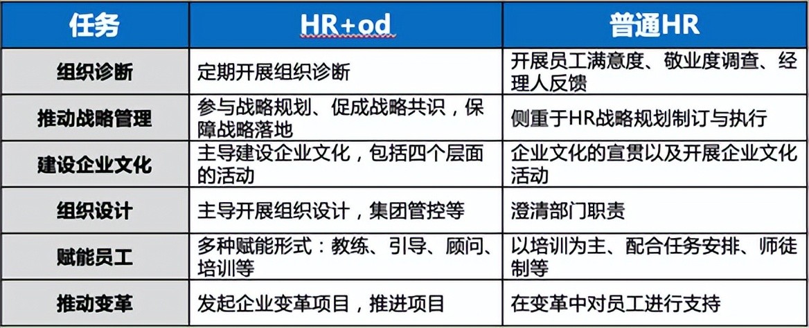 从上图可以看出,具有OD能力的HR从OD诊断入手,首先了解组织全貌,从而参与战略的规划、共识、落地,主导企业文化建设,主导开展组织设计,通过多种形式赋能员工,发起组织变革项目。而普通HR,在上述活动中多为辅助者角色而非主导者角色。因此,具有OD能力的HR将给组织带来更多价值,这也是现今越来越多HR学习OD的原因。