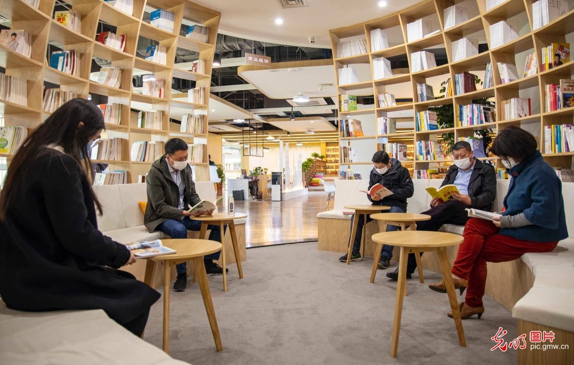 2020年4月23日,市民在江苏省泰州市医药高新区东方温莎小镇邻里中心城市书房内阅读。(顾继红摄/光明图片)