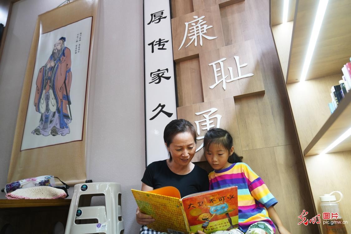 2020年8月29日,山东省日照市东港区一名老人在海曲公园城市书房内和孙女一起读书。(董乃德摄/光明图片)