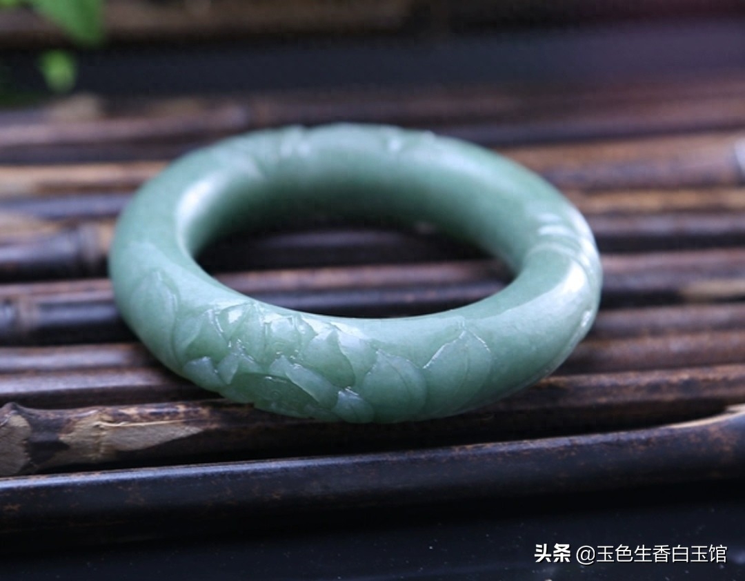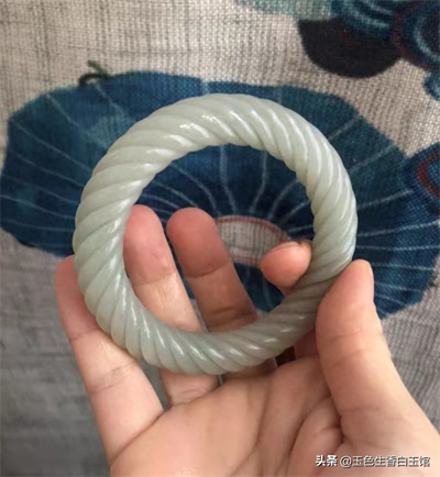 雕刻了大朵莲花的青玉镯子。恍惚似青海蓝调的广义和田。