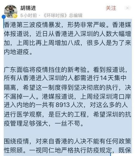 这两天,知名大V胡锡进在社交媒体上发布消息,提醒香港正在暴发第三波疫情,形势非常严峻。香港媒体报道,近日从香港进入深圳的人数大幅增加,上周比再上周增加八成,很多人是为了来内地避疫。
