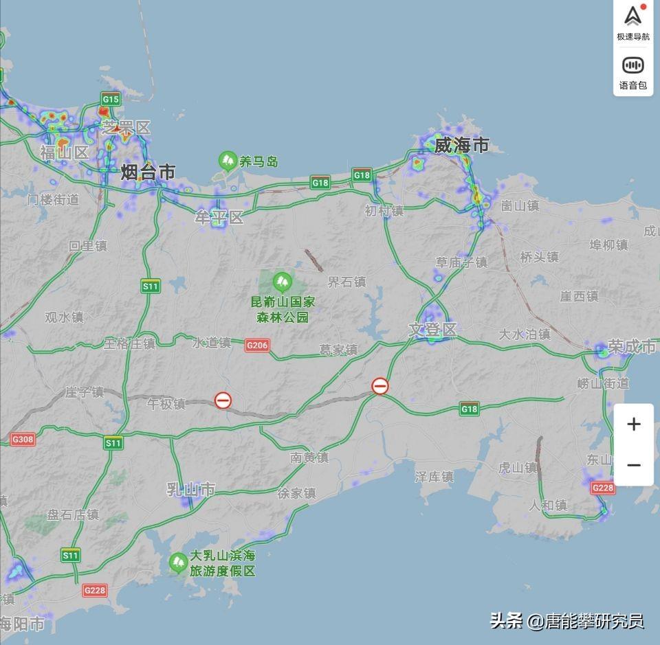 从热力图上可以直观看到烟台的城市面积远大于威海,毕竟是5个区与2个区的比较。