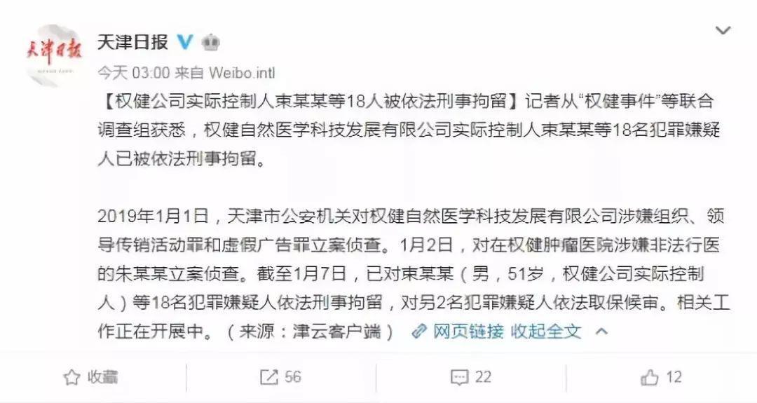 截至1月7日,已对束某某(男,51岁,权健公司实际控制人)等18名犯罪嫌疑人依法刑事拘留,对另2名犯罪嫌疑人依法取保候审。相关工作正在开展中。