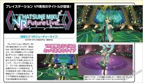 索尼的PS VR将于2016年10月13日发售,在发售当日将会配信初音未来的VR模式(收费下载版本),这是初音系列的重大更新,虚拟的演唱会场景给玩家身临其境的没入感。玩家的行动还会改变角色的演出方式(アンコール!アンコール!o(*≧▽≦)ツ)VR模式的收录乐曲将于后日发表。