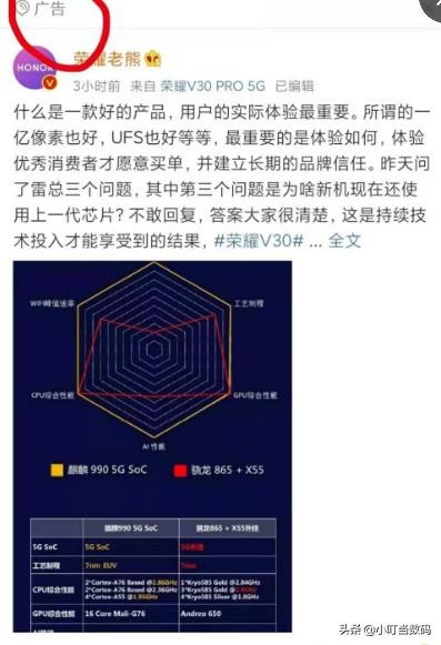 事情还是关于骁龙865的科普,小米方面给出的数据显示骁龙865在各个方面都碾压麒麟990 5G。对此荣耀老熊看不过去,为了捍卫“理工男”的尊严,出面进行反向科普,这一次麒麟990 5G又全面碾压骁龙865,到底谁说的才是真的,估计不少网友也迷糊了。好吧,这不是重点。重点是荣耀老熊为了让更多人看到这个科普贴,居然还买了广告推广。所以就被卢伟冰再次抓住了槽点。