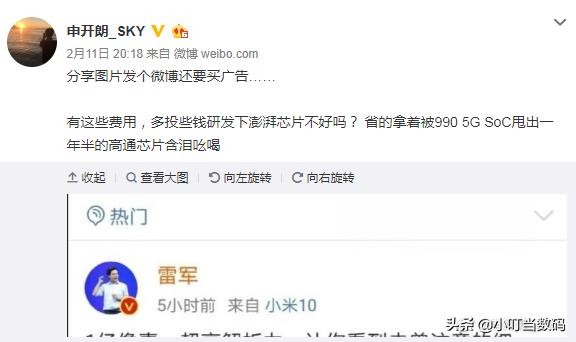 比较尴尬的是,荣耀申开朗还放出了一个雷军微博热点的截图。表示雷军发个微博也买了“热门”广告。同时吐槽友商,把这些钱用来研发澎湃芯片不好吗?但是申开朗的这一回应很快就被网友打脸了。因为热门是粉丝头条标志,并不属于广告。