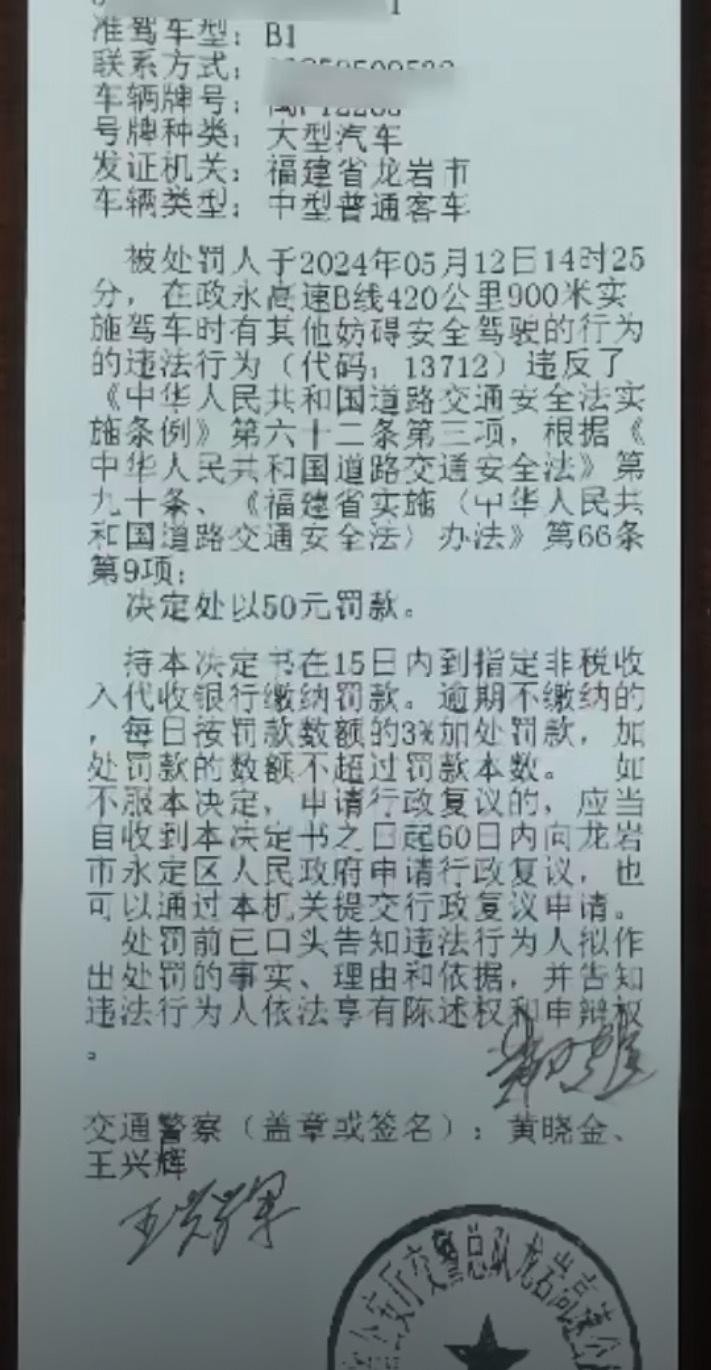 交警开具的罚单显示,驾驶员于5月12日存在妨碍安全驾驶的违法行为,处以50元罚款。