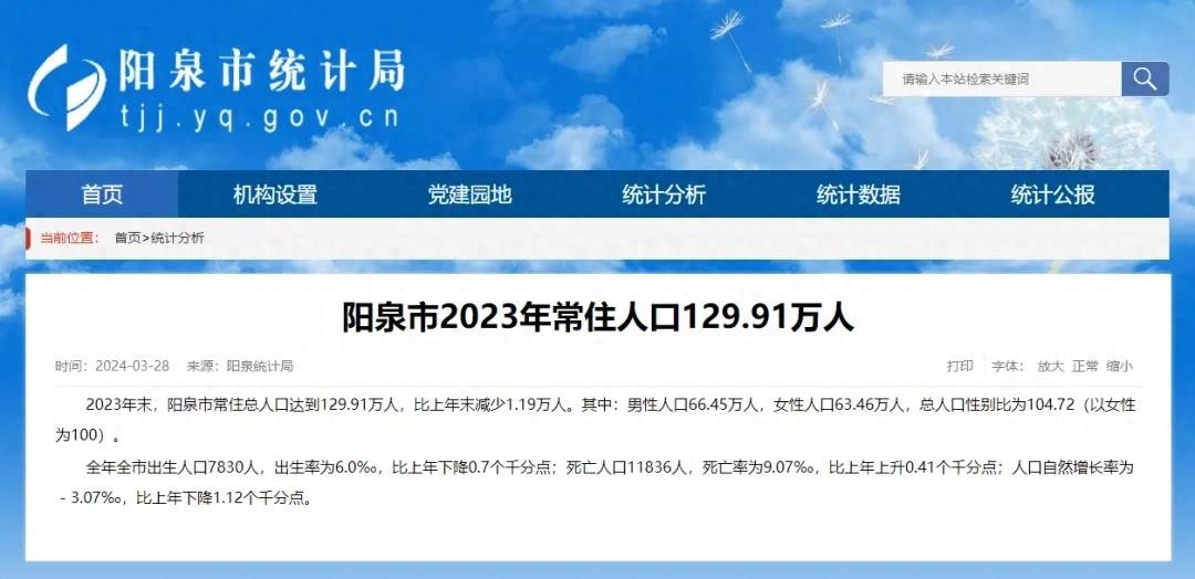 全年全市出生人口7830人,出生率为6.0‰,比上年下降0.7个千分点;死亡人口11836人,死亡率为9.07‰,比上年上升0.41个千分点;人口自然增长率为-3.07‰,比上年下降1.12个千分点。