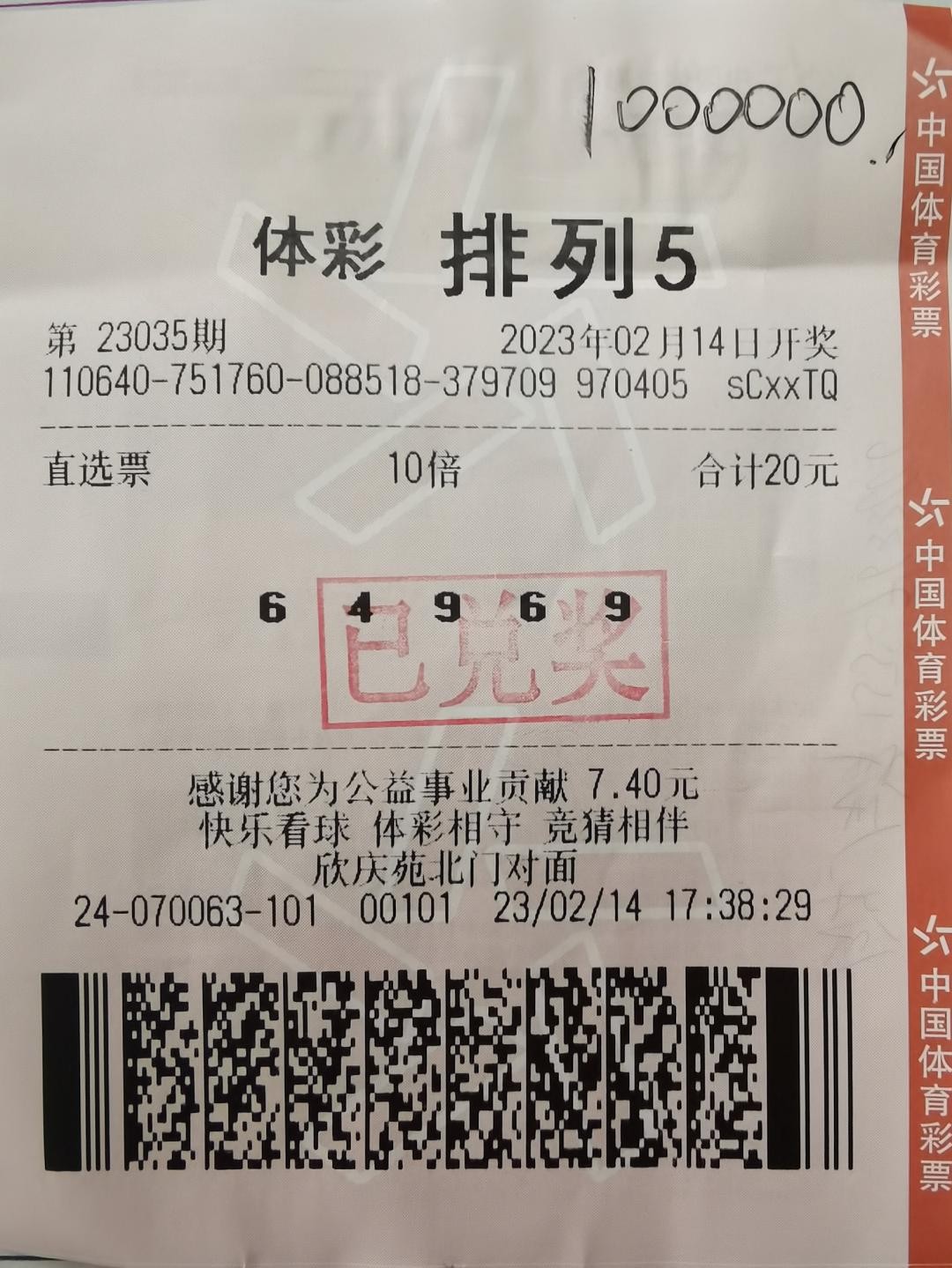 2月14日,体彩“排列5”第23035期开奖,开奖号码为6、4、9、6、9。当期宁夏共中出11注“排列5”一等奖,其中10注由位于吴忠市欣庆苑的体育彩票实体店中出。2月16日,中奖者赵先生(化姓)来到宁夏体育彩票管理中心办理了兑奖手续,赵先生以一张单式10倍票中得100万元大奖。