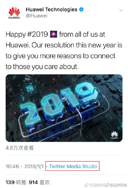 【华为用iPhone发新年祝福 推文后秒删:场面贼尴尬】华为官方Twitter以华为全体员工的名义向网友送上新年祝福。不过,这篇推文下方却留下了“自Twitter的iPhone客户端发出”(Via Twitter for iPhone)的标记。华为发出这条推文后,随即将其删除,然后重新发送。不过还是被眼尖的网友迅速截图了。(财经网)