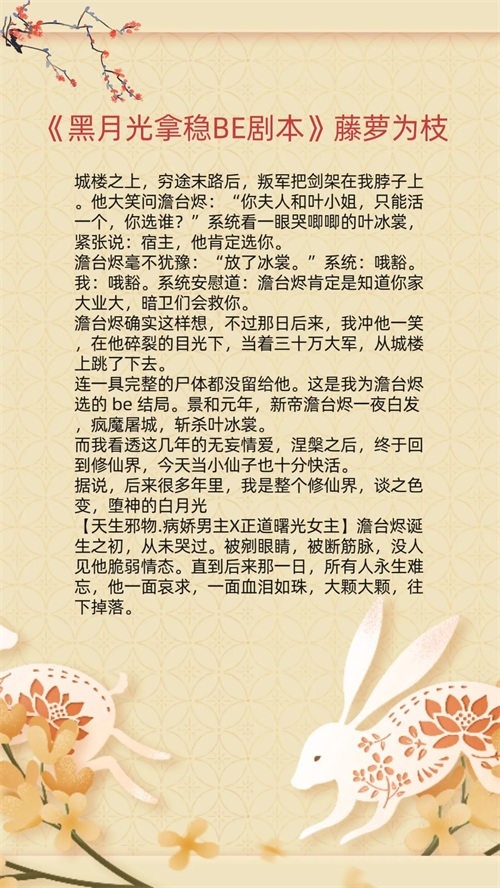澹台烬以为黎苏苏是他这辈子唯一的希望,女主为了天下苍生亲手在他心上钉了六枚钉子,最终任务失败,被男主关在牢里折磨,两人相爱相杀,过程虽然虐心,但结局是好的。