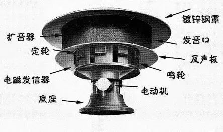 二战时英国伦敦的防空警报--电动机是警报器的动力,带动鸣轮旋转,起到发声的作用。底座是整个警报器的支架。