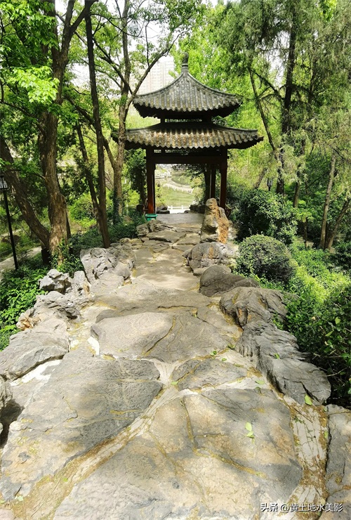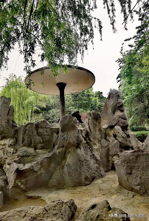 在郑州人民公园内东门进门囗西南方向一侧的假山歇息亭风光。