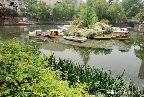 位于郑州人民公园东南侧水域上的湖心岛,小巧玲珑,被一堆小船围聚。
