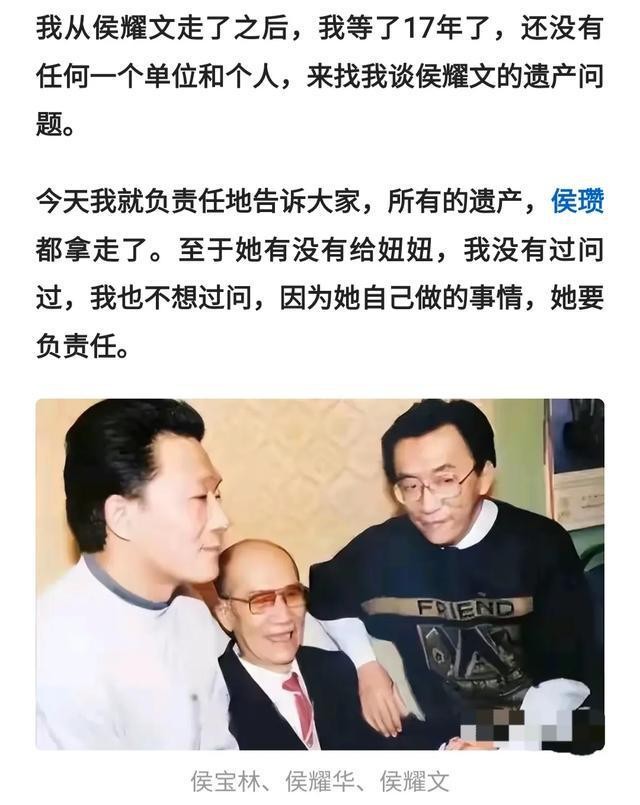 情况可能远比想象中更加复杂,当年侯耀文的葬礼事宜全权由侯耀华负责,至于遗产案其实可以总结为三点,首先就是侯瓒没有证据表明侯耀华侵占遗产。