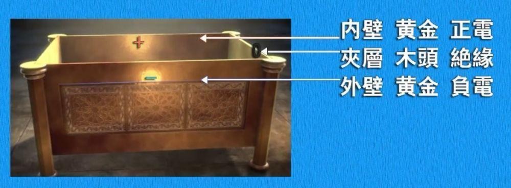 专家猜测说,约柜其实是一个电子设备,里面一共有三层结构,其中最里层和最外层都是黄金,只有中间是绝缘材料,内壁带正电,外壳带负电。犹太祭司穿着全套防护服才敢使用约柜,防护服的外层制作材料包括宝石和石头片。