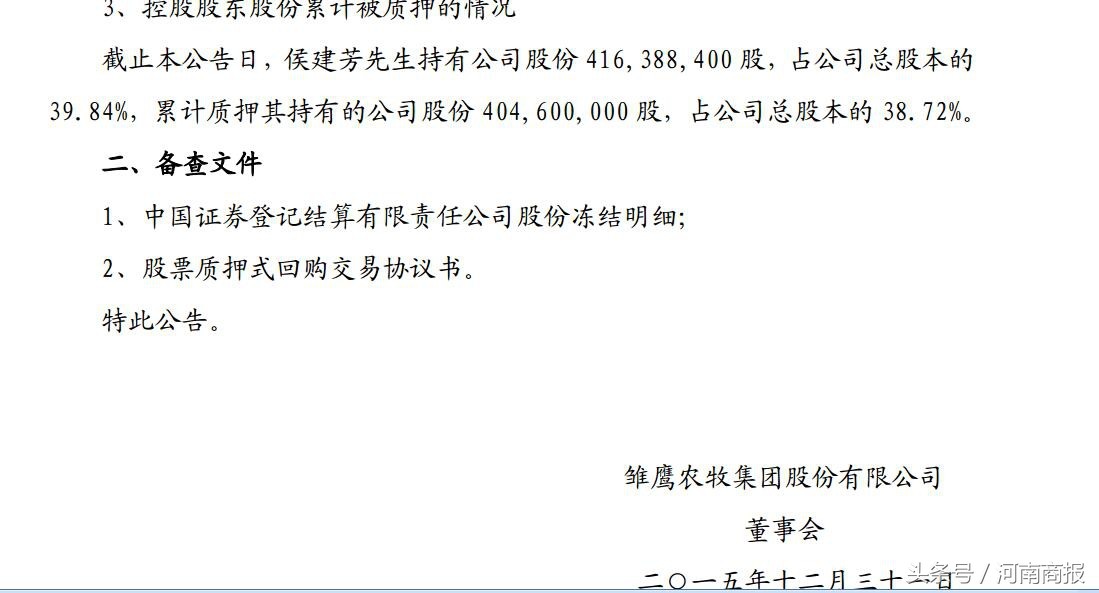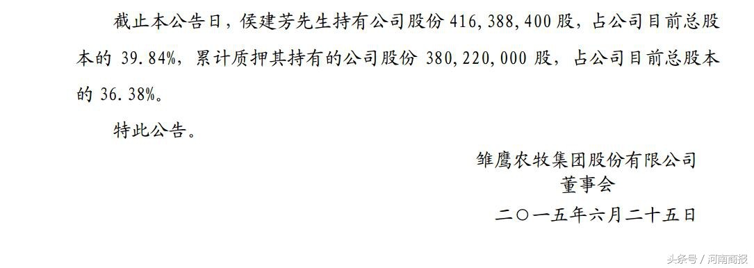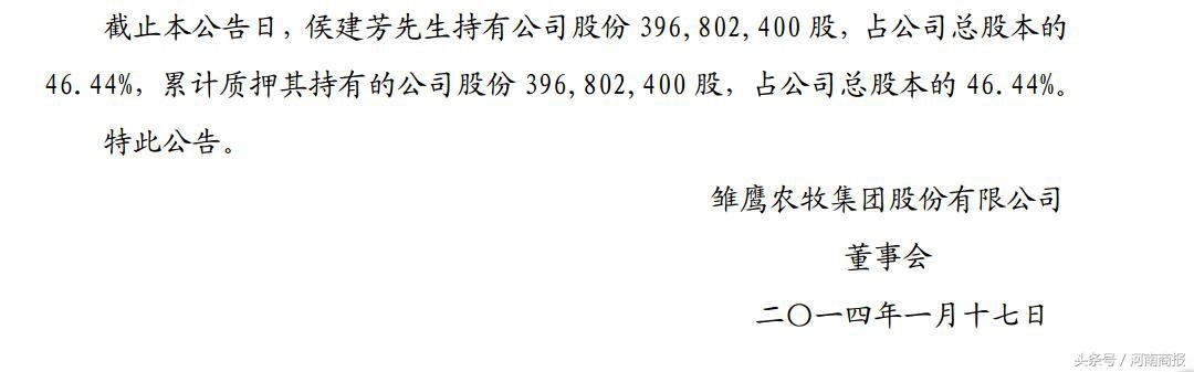 河南商报记者查询雏鹰农牧上市以来的公告发现,2012年上市没多久,侯建芳就开始抵押手中的股权,当年5月侯建芳持有公司总股本的46.42%,他拿出11.24%质押为公司的子公司申请2.5亿元融资贷款提供担保,用于三门峡雏鹰农牧有限公司项目建设。