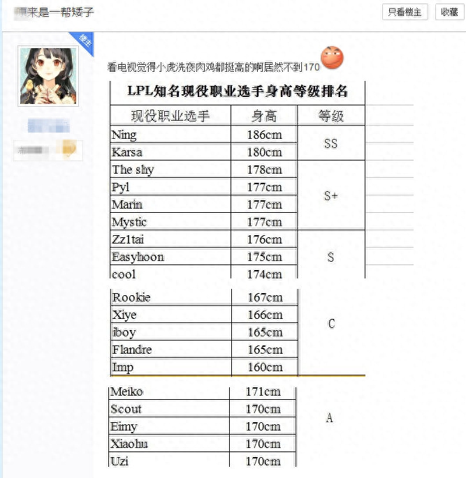 此外,体格大块但是不高的还有Uzi,从这份表格中可以看到Uzi排在A级刚好1米7,甚至比Meiko还要矮1公分。有网友表示不信,随后便引来与小狗合过影的粉丝证实,他表示自己只有1米66,可合影的时候发现小狗和他差不多高。此外也有人表示生活中碰见的年轻小伙基本都有1米8左右,没想到职业选手普遍都不怎么高,最气的是他们的女朋友个个都很不错,或许这就是靠职业出名的顶级选手吧。