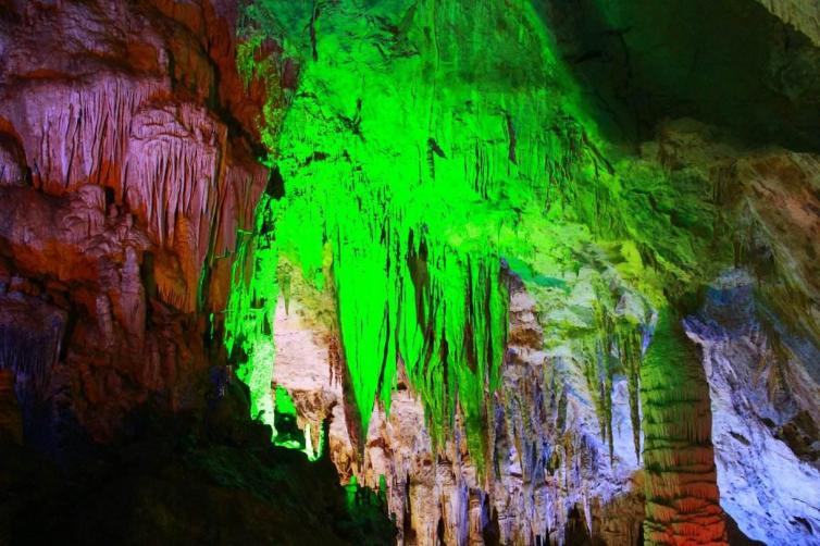 接着我们来到了中国唯一的世界遗产洞穴——芙蓉洞。洞内千奇百怪的钟乳石和五颜六色的霓虹灯凑成一副朦胧而又奇幻的的景象。洞内的五绝是:珊瑚瑶池、巨幕飞瀑、生命之源、犬牙晶花池和石花之王,这些都是天地灵秀之瑰宝。