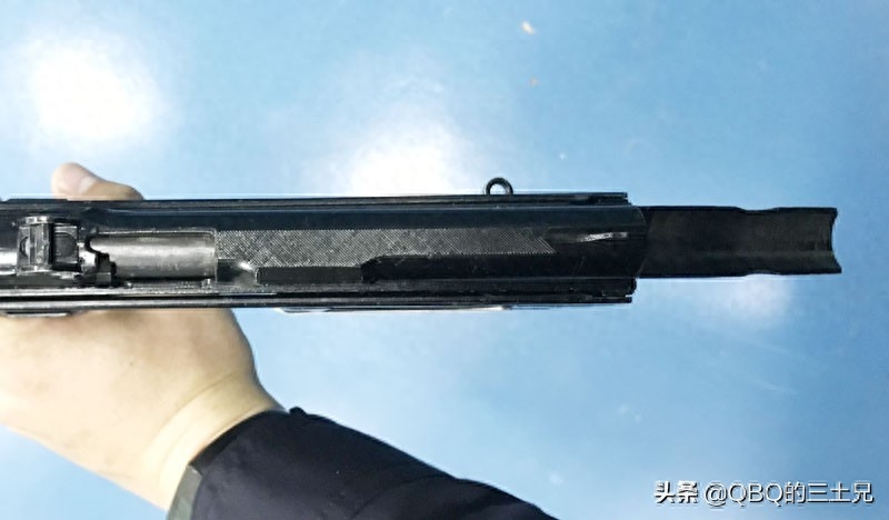 82式冲锋枪的顶部,最右侧是鸭嘴形防跳器,可见零件形状十分复杂。