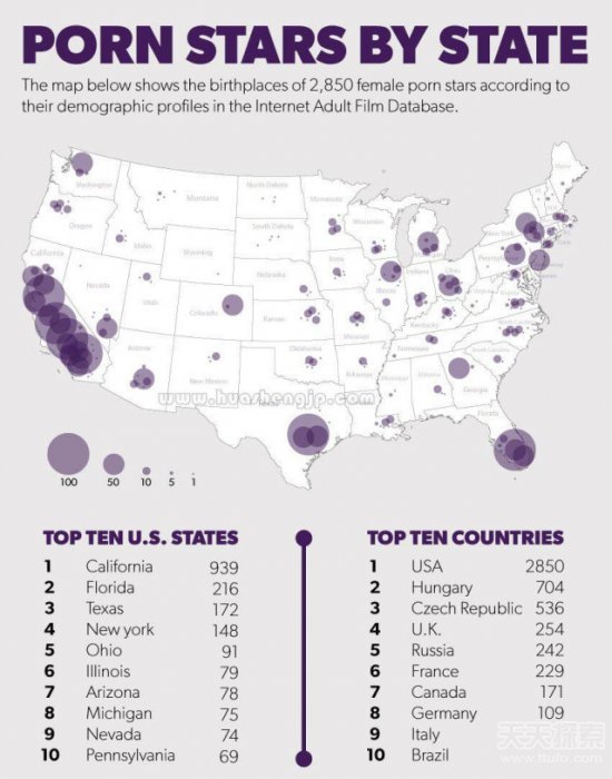 左:美国本土成人电影产量最多的州;右:全世界成人电影产量最大的国家。这些国家按名次排名分别是:美国、匈牙利、捷克、英国、俄罗斯、法国、加拿大、德国、意大利、巴西。