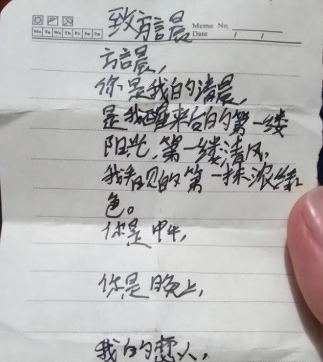 这封情书《致方言晨》,文笔非常好,你是“我的清晨”、“醒来后的第一缕阳光”、“第一抹浓绿色”,这些词句读起来就非常有感觉,被形容的这么美好,收到这封情书的对象内心应该很开心吧。