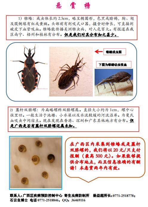 据了解,国家有个“外来入侵生物调查”的重大课题,广西承担了这个课题内的锥蝽、福寿螺的,去年广西区疾控预防控制中心也曾发布过悬赏榜