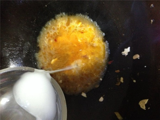 二是把炸好的原料捞出,锅内留少量油底,下入兑好的滋汁,倒入锅内推匀,待汁收浓起泡时,再下入炸好的原料拌炒,使芡汁均匀地裹附在原料上,如:炸制鱼香脆皮鹑蛋。