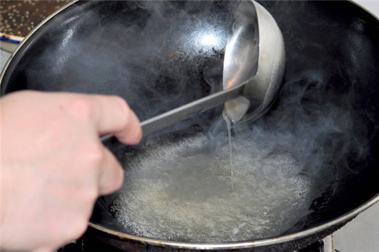 勾芡时锅内的油要适量,油多了芡汁不易挂上原料上,应滗去一点;油少了芡汁不明亮,可在勾芡之后上菜之前浇上少许明油。